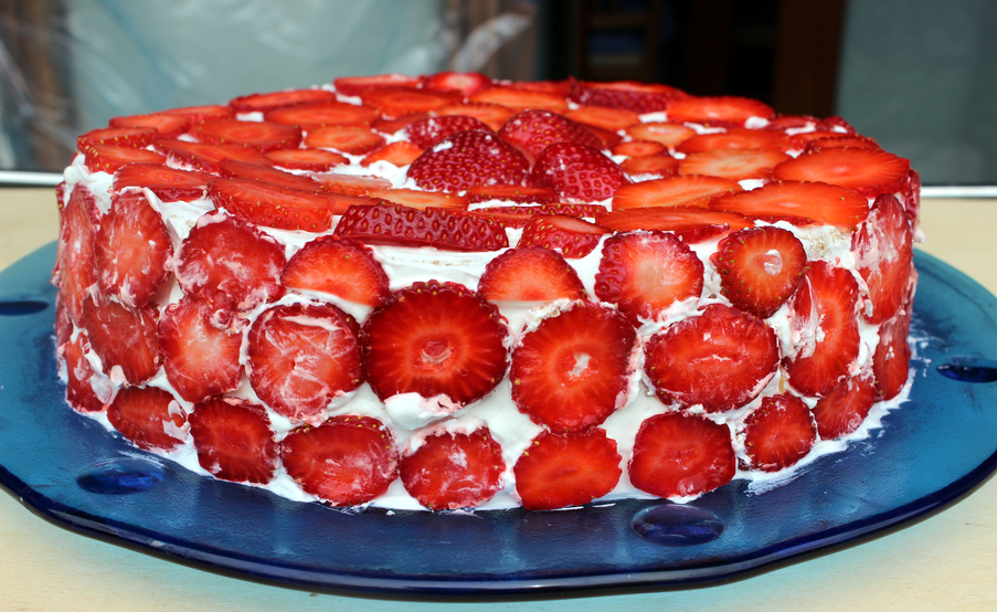 Para cobertura bata o chantilly com creme de leite fresco (aquele que você encontra na geladeira do supermercado, junto com os laticínios), conforme a receita que aparece na embalagem, cubra o bolo e enfeite com mais morangos, como na foto.