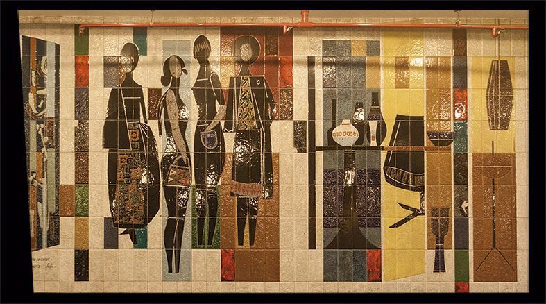 Azulejos sobre o elevador sinalizam a expectativa de público e funções da galeria na década de 60. Elegância nas roupas e no entorno arquitetônico, criando uma sociabilidade refinada.