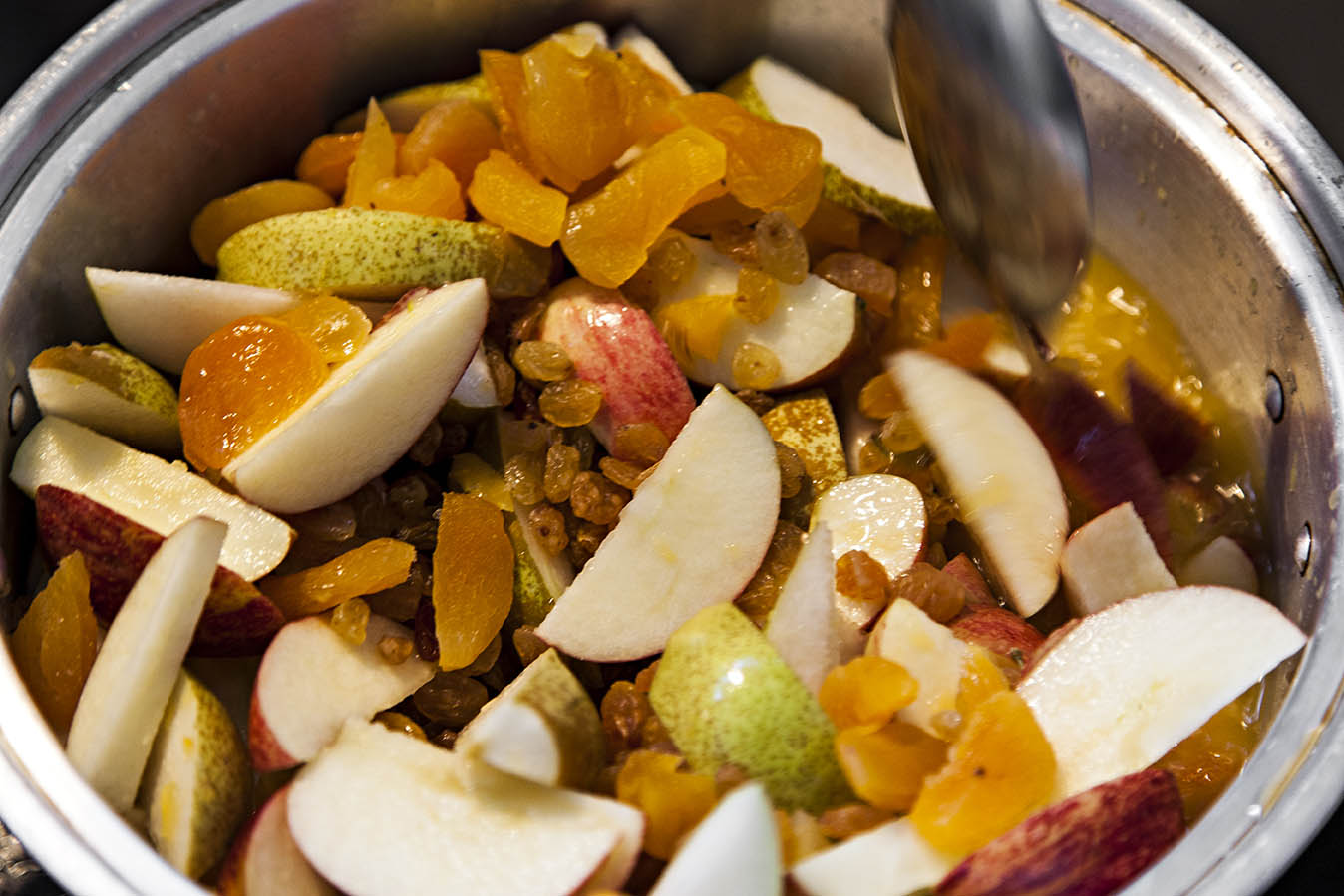 Esprema as laranjas, pique as maçãs e peras em tamanhos regulares para que o cozimento seja mais ou menos uniforme, corte os damascos em tirinhas e as carambolas em estrelinhas para enfeitar …