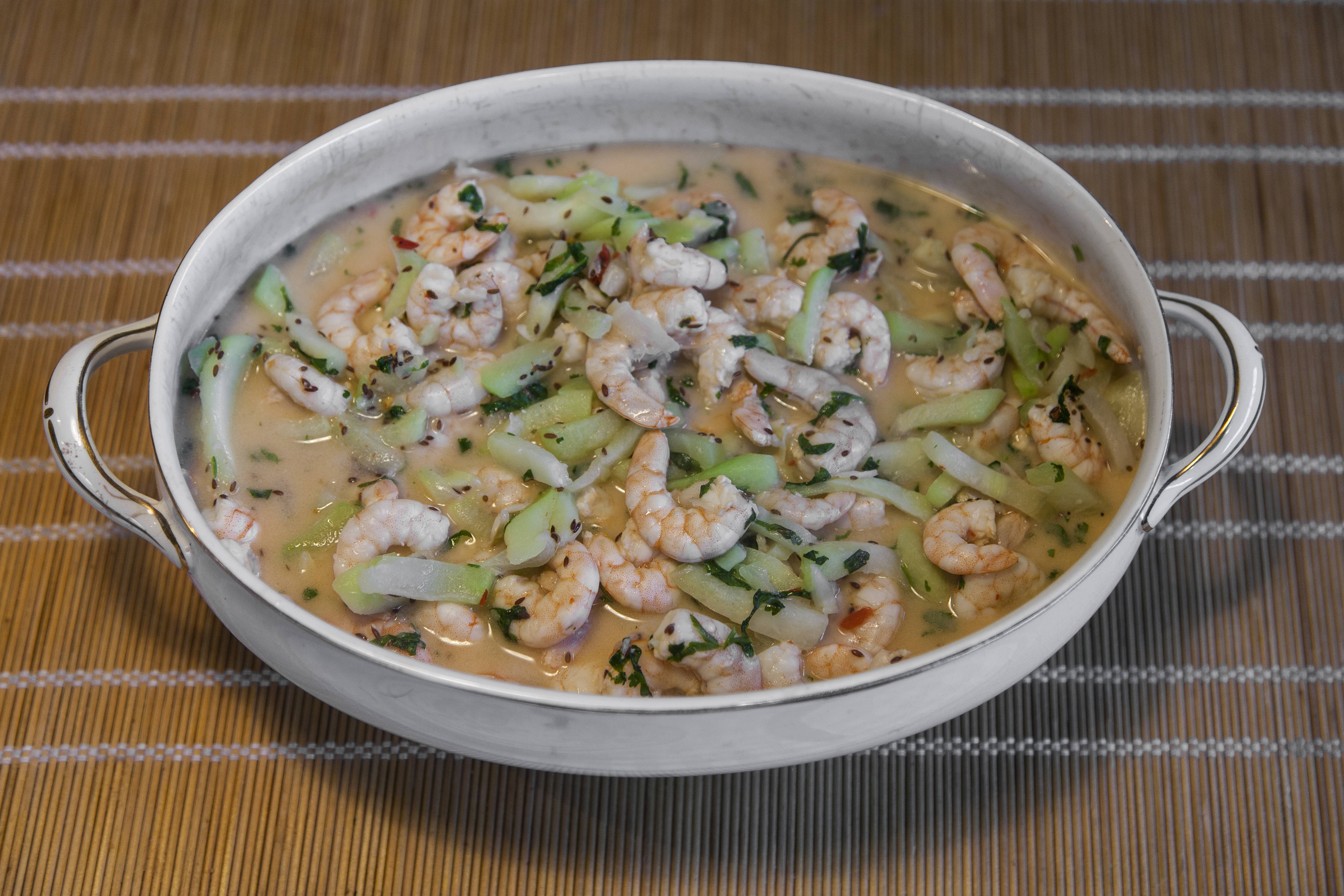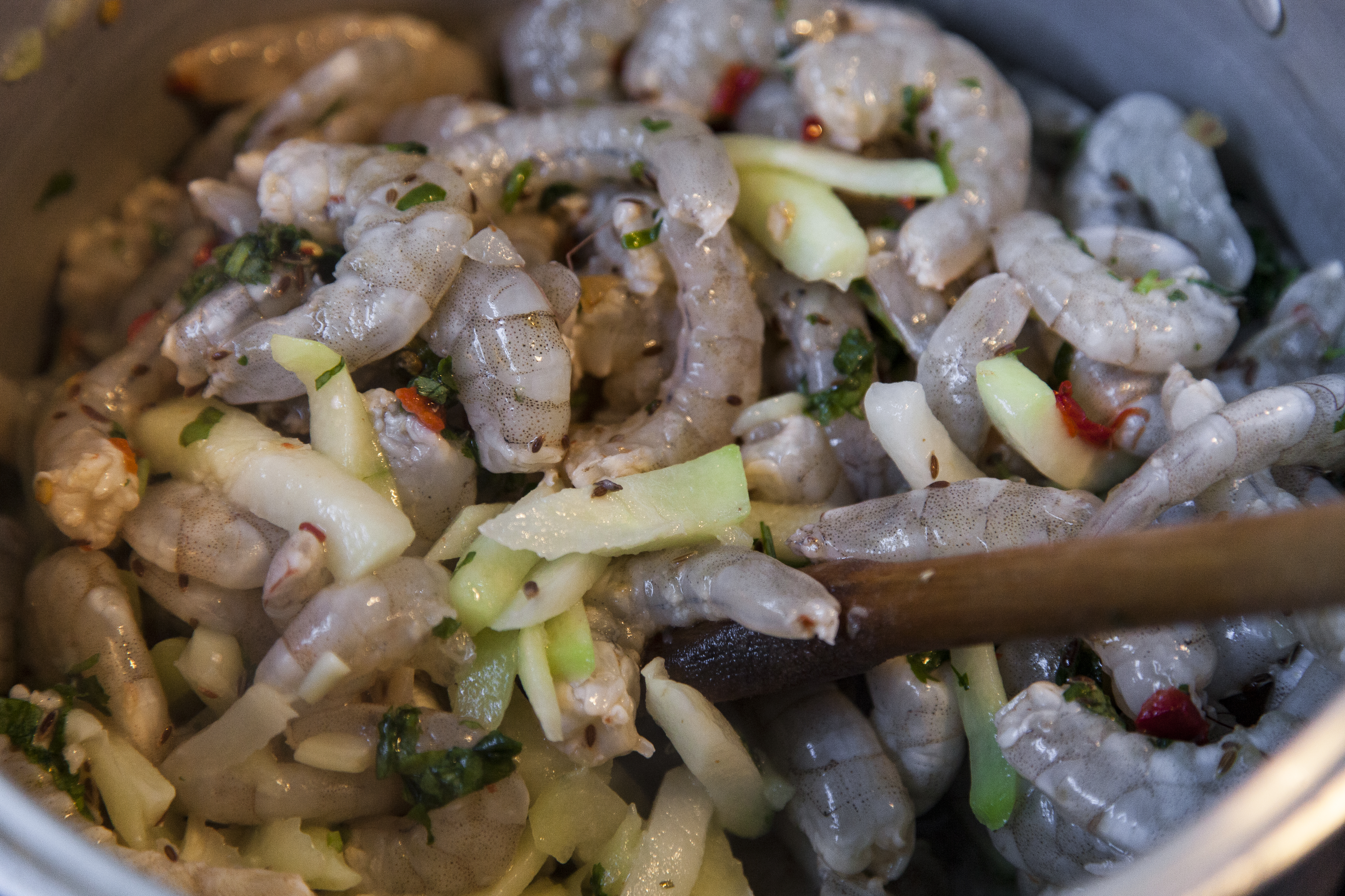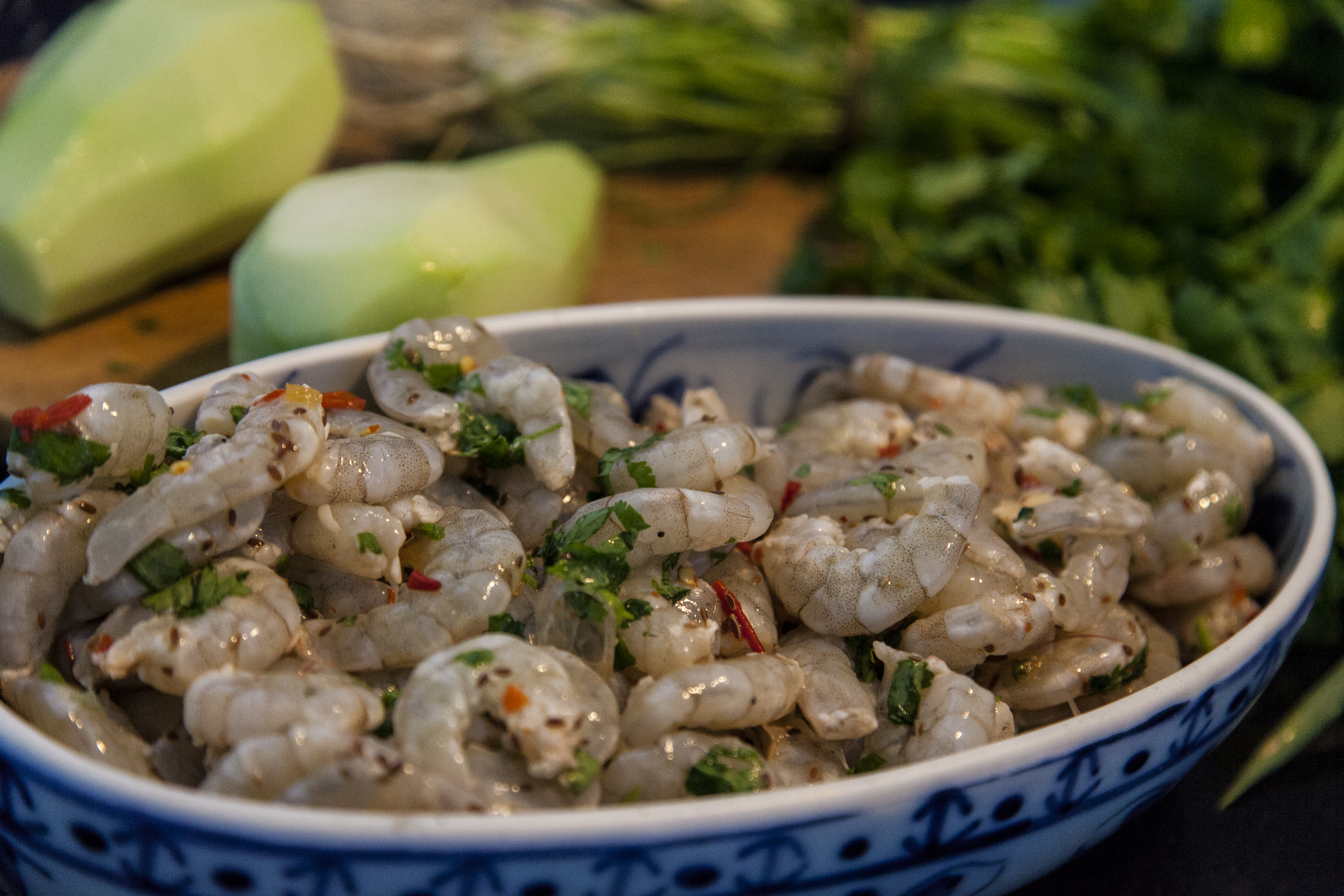 Tempere os camarões com coentro, sal, pimenta e endro, pique os chuchus em tirinhas mais ou menos na proporção dos camarões.
