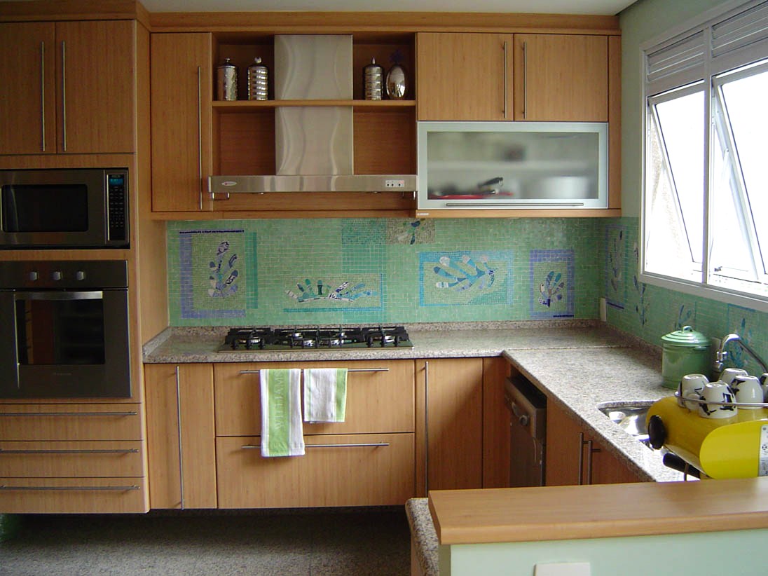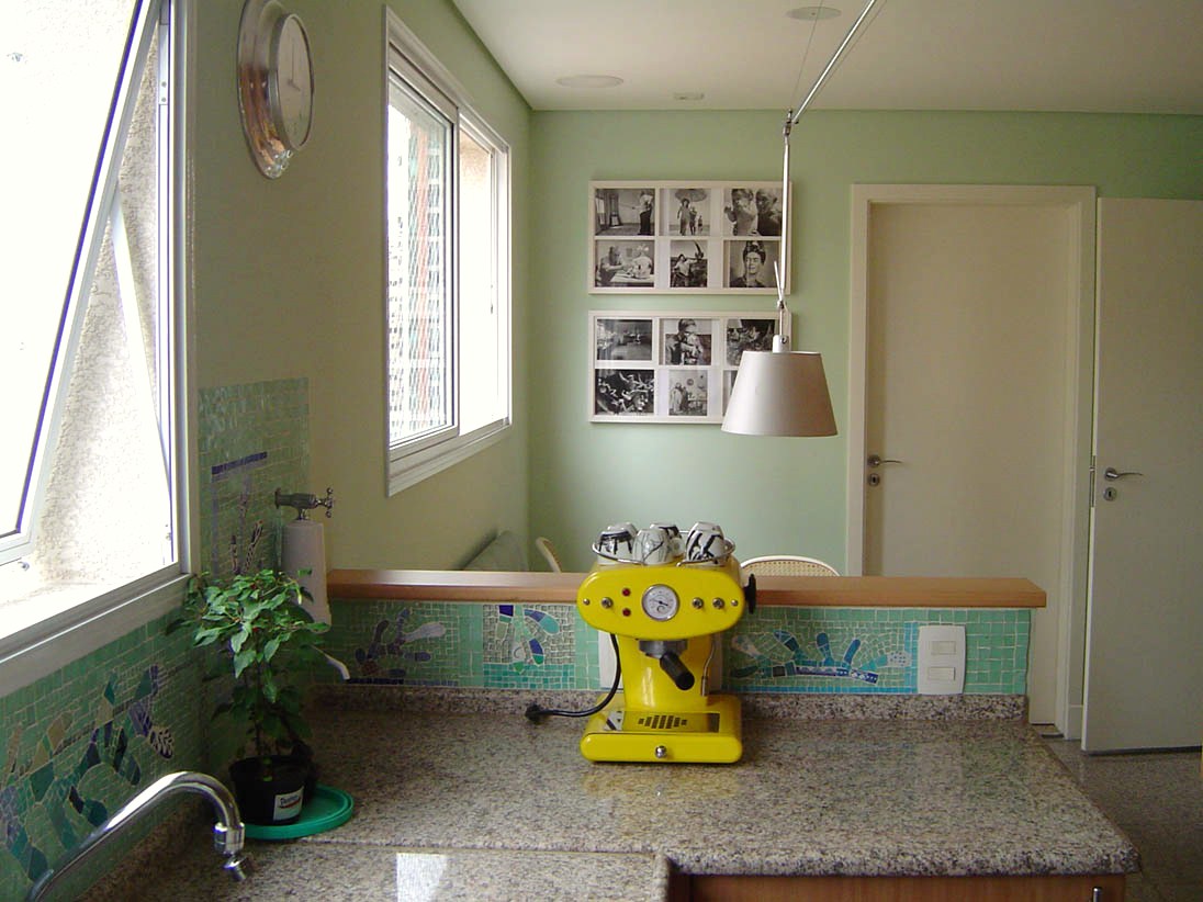 A opção pelo mosaico traduz o desejo de ter uma cozinha única, em que o prazer de estar lá é completado por um cenário que abarca variações de tonalidades conforme a luminosidade muda e pela observação cotidiana de cada segmento do painel com temas e cores diferentes.
