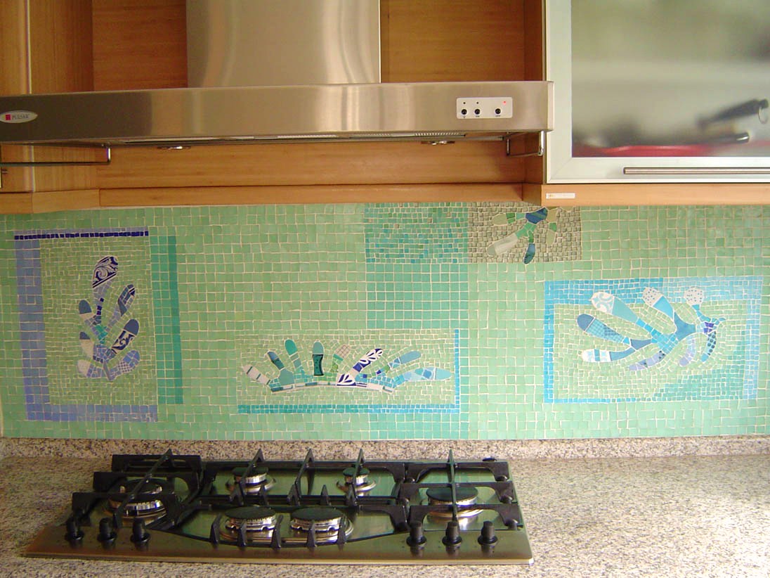 Este tema foi proposto como mosaico para frontão de cozinha com outra combinação de cores, ainda remetendo a uma gama marinha.