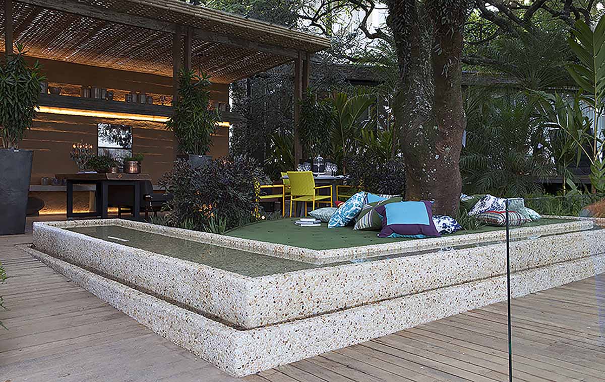A varanda criada pela cactus arquitetura para a Casa Cor 2015 traz uma brasilidade de férias e relax. Resgatando técnicas tradicionais de construção brasileira como a taipa de pilão, trazem à memória valores afetivos de nossa história e é também um apelo à sustentabilidade.