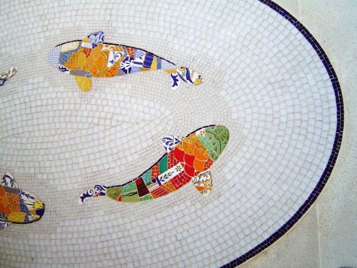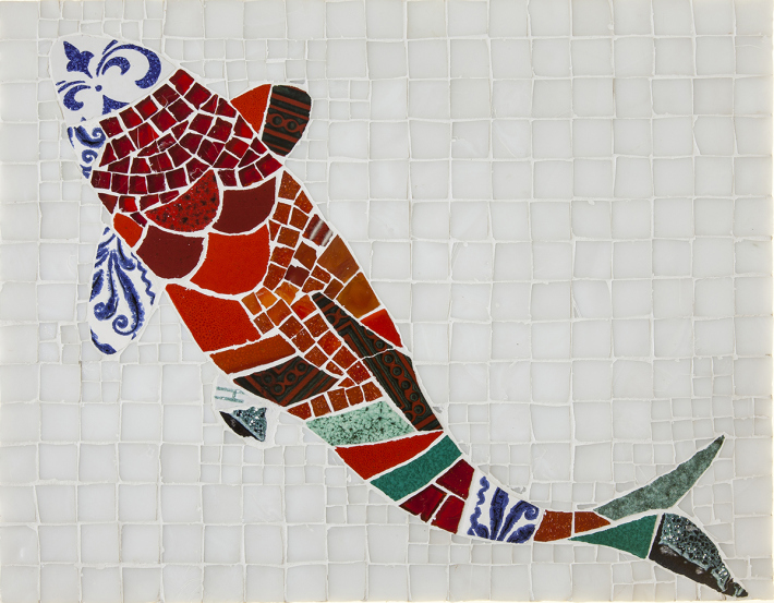 Detalhe do mosaico das Carpas que exibe cores contrastantes sobre fundo branco, a montagem das pequenas peças sugere volume e movimento às figuras montadas com estampas e o cores de cerâmica e vidro.