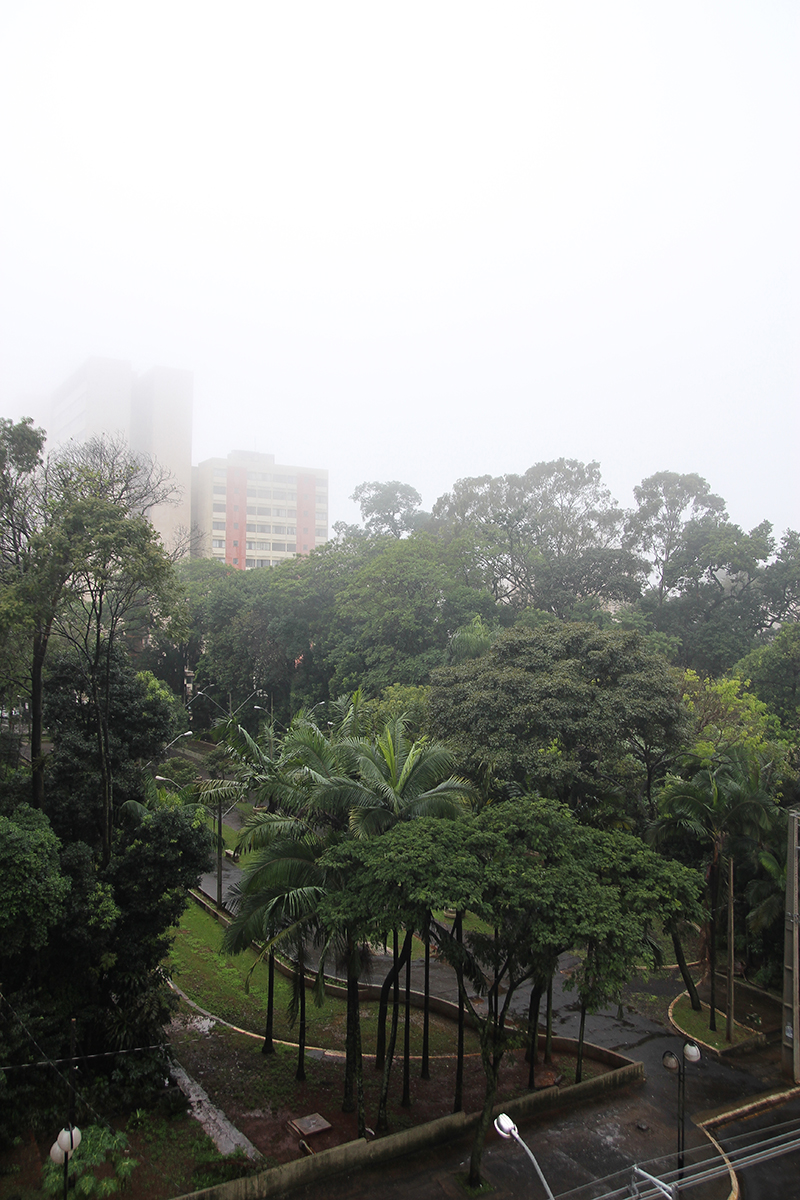 Nesta foto podemos ver a como a política de corte é contínua e injustificada, pois neste pequeno trecho faltam 3 árvores. Dia 6 de junho, dia de grande neblina, ainda nos restava uma sibipiruna jovem na calçada.