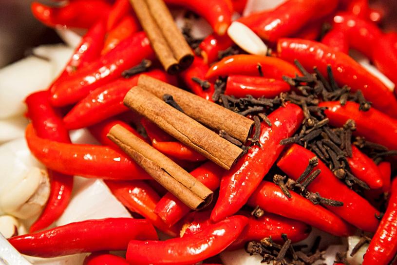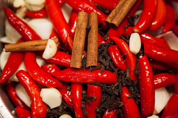 Meu molho aprendi com a dona Hermínia, avó de meu marido, e vão vários temperos tradicionais da cozinha brasileira, cebola, alho, cravo e canela, louro, com linda pimenta dedo de moça. Se cozinha tudo com vinagre branco, sem óleo e depois de frio se bate no liquidificador com pouco líquido para ficar bem vermelhinho. Guardar em vidros escaldados reaproveitados das conservas industrais.